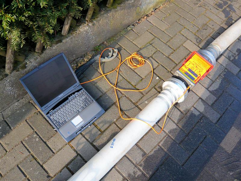 An der zu prüfenden Feuerlöscharmatur wird ein Durchflussmesser installiert und die Ausflussmenge und der Fließdruck gemessen. Diese Daten werden an einen Rechner übertragen und protokolliert.